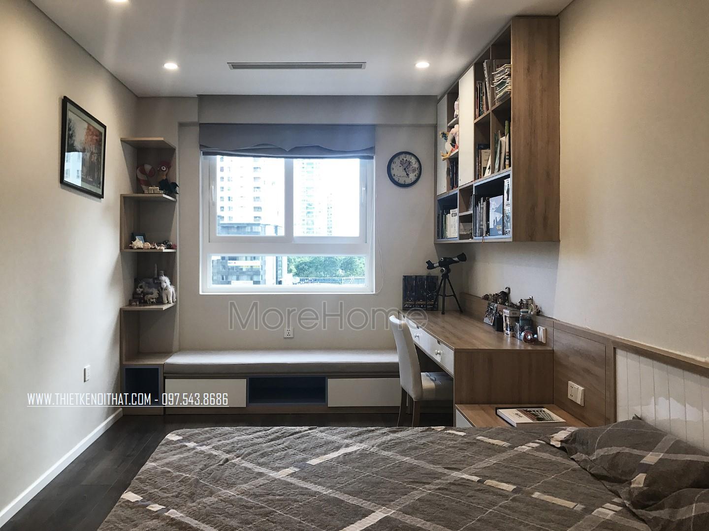 Phòng ngủ được thi công khá tối giản với mẫu đồ nội thất âm tường. Chiếc tủ áo với chất liệu gỗ verneer tối màu cửa trượt được thiết kế âm tường tạo sự đa năng nhất định cho người dùng. Kệ tivi phòng ngủ cũng được thiết kế âm tường giúp giải phóng không gian một cách tối ưu nhất. Bàn trang điểm kết hợp với bàn làm việc được thiết kế kéo dài từ của chính vào của sổ tạo nên một mảng tường với ứng dụng tuyệt vời nhất.
