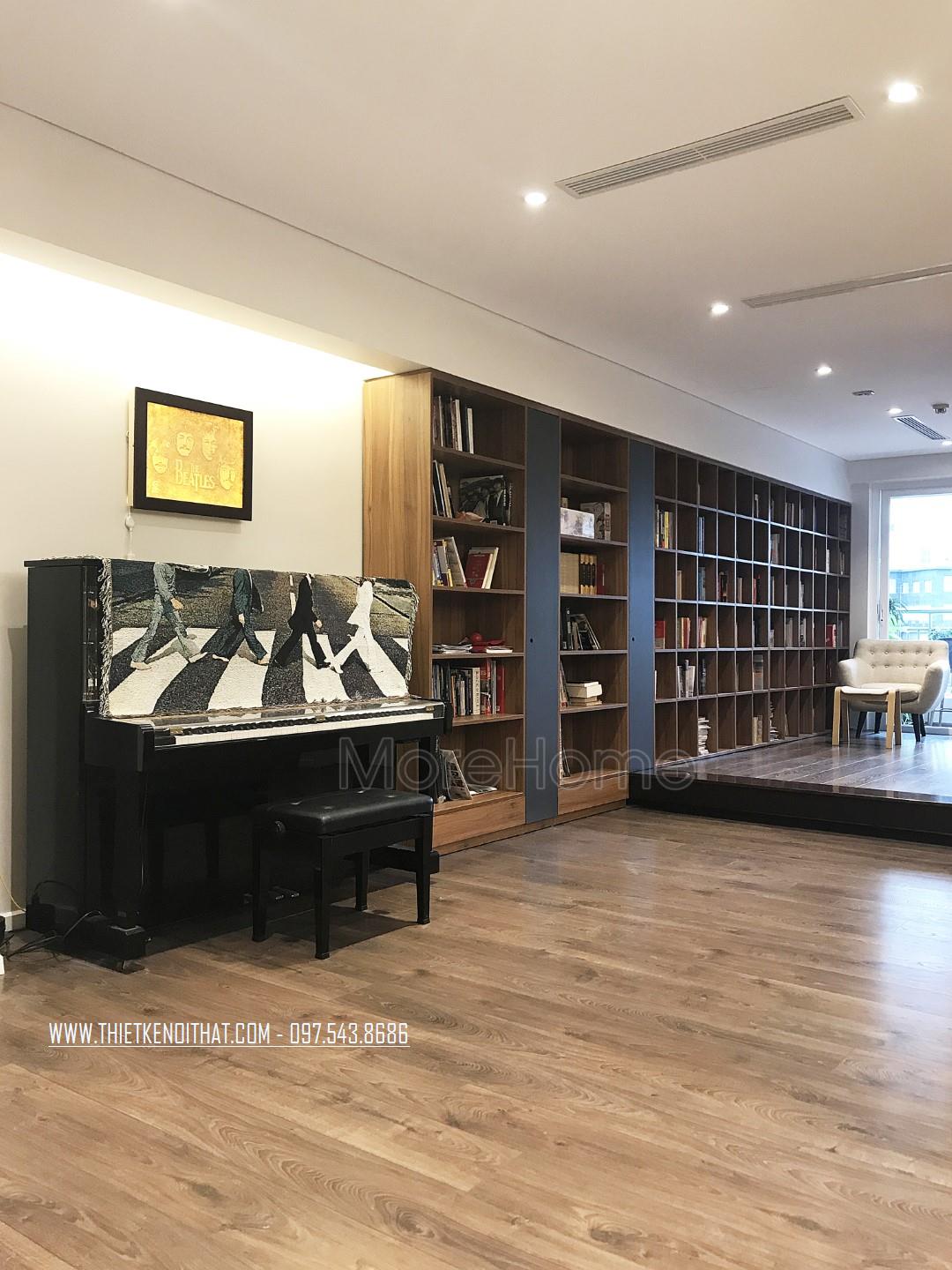 Thi công nội thất phòng khách: KTS chọn sự tối giản nhất cho phòng khách. Bộ sofa giữ chức năng chính trong không gian phòng khách này, sofa được chọn với chất liệu da, tone màu trắng tạo nên sự tinh tế nổi bật giữa không gian phòng. Đi sâu vào trong của phòng khách KTS đã thiết kế cho gia chủ bộ kệ trang trí với tone màu trắng đen và chất liệu sắt là chủ yếu. Chiếc kệ được đặt mép tường kéo dài từ phòng khách đi vào hướng các không gian phòng phía trong. Kệ trang trí được thiết kế với công năng sử dụng là để sách, túi và vật dụng cá nhân của gia chủ.